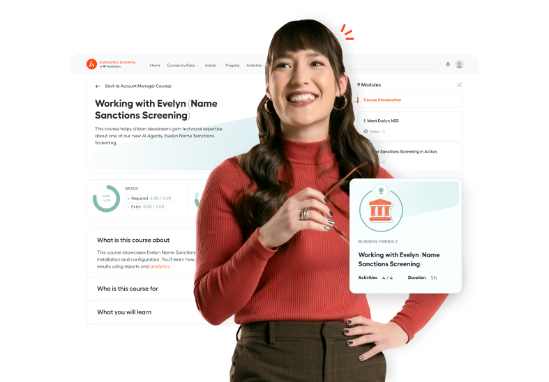 This course showcases Evelyn Name Sanctions Screening, one of our new AI Agents, including her full installation and configuration. You’ll learn how to run Evelyn via Control Tower, review and analyze her results using Analytics, and retrieve reports