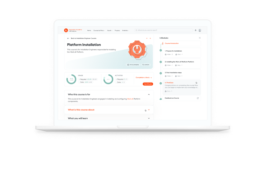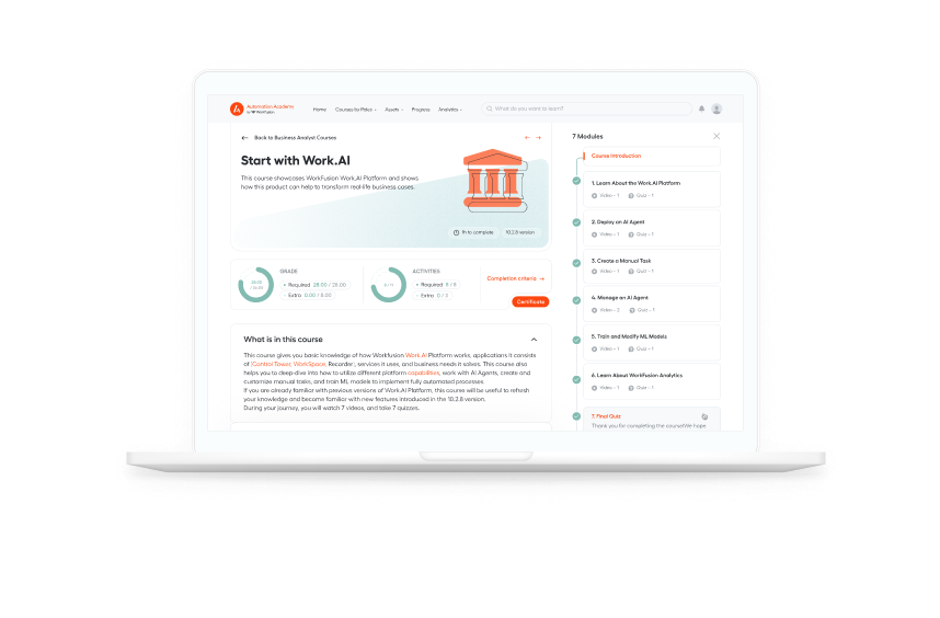 This course is for business people who recently purchased WorkFusion’s Work.AI Platform or are considering investing in an automation platform. It is also helpful for technical users who want to learn more about and start automating with Work.AI Platform. No technical skills or elevated automation knowledge are required for this course.